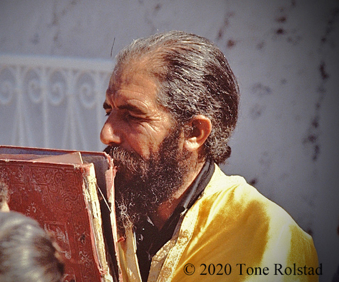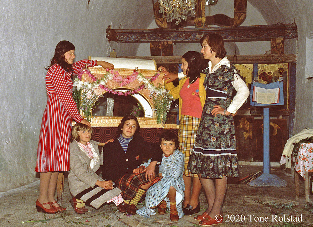 We soon learned that Papa Georgios’s ceremonies were long. The villagers knew when to arrive in church (not too early and not too late), but somehow we never caught on. If we were told that proceedings would start at 7 o’clock in the morning, we would show up around 7:30 and find ourselves more or less alone with the priest. One time we came when the church service was almost over and received stern glances from the priest. Some of the older women would bring a chair while the rest of us had to stand for several hours in a cold church. But the ceremonies where never dull. Papa Georgios would crack an occasional joke, and during Easter celebration he called the young girls forward to sing along during the service. Fortunately, they were soon returned to being just part of the congregation since they neither knew the text nor could sing.