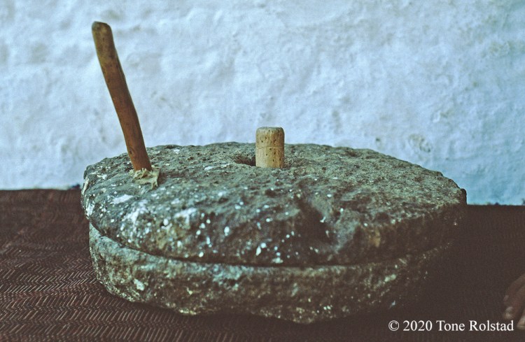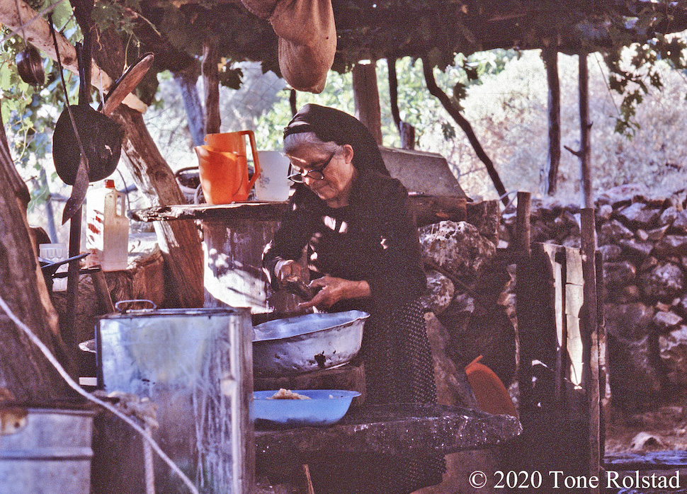 There were great differences in the amount of daily work for women in Agios Ioannis. A woman with several small children had little time for needlework and gossip. Her work was heavy and time consuming. Water had to be drawn directly from the cistern during the fall and winter period (i.e. August/September to March/April), when the cistern’s water was too low to provide a flow through pipes to several faucets situated throughout the village below. Even though women had propane gas stoves, they mostly cooked their meals and heated water on an open fire. Clothes were washed by hand, and during the cold and damp winter, these could take days to dry. Women also made their own soap. A woman with no small children but rather a teenage daughter to help her in the house, had plenty of spare time to sit around with their neighbours. The old women who lived with their husbands or sons also had time to visit each other.