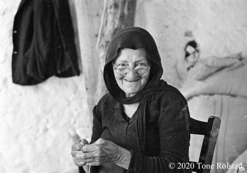A woman was seldom seen sitting down without her needlework, and she usually brought it with when she went visiting. She washed and dyed the wool gathered from the sheep in May and June, knitted the “blousa” (the men’s woolen undershirt), wove tablebloths or “sakouli”, crochets, embroiders and did repair work. However, on Sundays and on certain other days she should not do certain kinds of work, and I was several times asked by the other women if I was knitting on Sundays, which I, of course, denied ever having done.